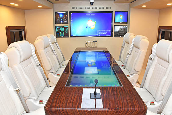 | 整車具備完善的通訊組網(wǎng)系統(tǒng)、北斗定位系統(tǒng)、視頻會(huì)議系統(tǒng)、音視頻取證系統(tǒng)、移動(dòng)辦公系統(tǒng),可實(shí)現(xiàn)野外開展視頻會(huì)議、決策指揮,能夠快速對(duì)突發(fā)事件進(jìn)行全方位一體化組織、策劃、協(xié)調(diào)及控制。 | ||||