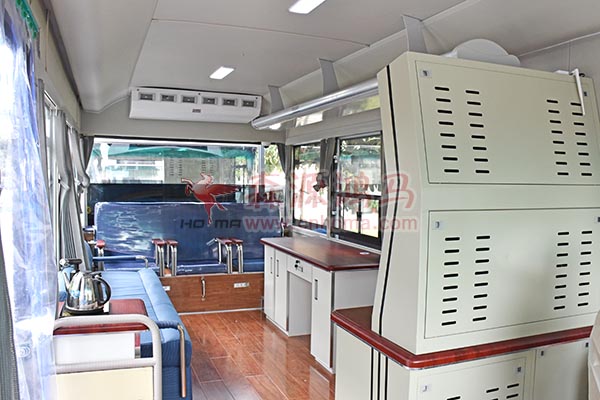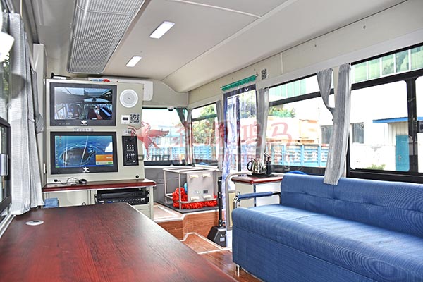 便捷的辦公環(huán)境。車(chē)內(nèi)的超大空間,大面積的車(chē)窗設(shè)計(jì)提供了更寬廣的視野,讓車(chē)內(nèi)人員尊享更自由的辦公環(huán)境,成倍提高工作效率。車(chē)內(nèi)配有一體式電腦的配置在節(jié)約更大的車(chē)內(nèi)空間的同時(shí)又具有更全面的功能,打印、掃描、復(fù)印三合一的打印機(jī)及碎紙機(jī)更能提供更加便捷的辦公條件。豪華組合內(nèi)飾加上微波爐、冰箱、飲水機(jī)、冰箱及一體式窗紗遮陽(yáng)簾的裝備,給人家一般的溫暖。